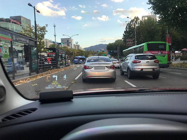 HUD와 더불어 운전습관도 변했다. 이전엔 운전하면서 내비게이션 지도를 확인하느라 수시로 센터페시아의 모니터를 기웃거렸다. 물론 기본적으로 음성안내도 나오지만, 다음 교차로까지 남은 거리나 유지해야할 차선 같은 정보는 화면에 의지할 수밖에 없었다. 이제 더 이상 그럴 필요가 없다. HUD가 실시간으로 알려주니까. 그래서 마음도 한층 더 여유롭다.