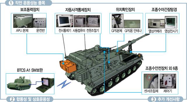 ◇ K9A1 자주포 8월 말 첫선, A2도 개발=유망 방산수출품으로 자리 잡은 K9 자주포 역시 진화한다. 이달 말부터 K9A1 자주포가 나온다. 양산이 종료되는 내년 말까지 군에 보급될 K9A1은 자동사격통제장치를 도스(DOS)에서 윈도(Window) 체제로 바꿨다. 보조동력장치(APU)를 달고 조종수 야간잠망경을 열상형으로 교체, 야간 전투능력을 끌어올렸다. 위성항법시스템(GPS)을 추가하고 안전 확보를 위해 후방카메라도 달았다. 육군은 기존 K9 자주포 전량을 A1 사양으로 개조할 계획이다. 앞으로 전방사단 포병은 최대구경 화포인 155㎜ K9A1 자주포 또는 K55A1 자주포로 무장하고 견인식 155㎜포는 동원사단으로 돌려지거나 전시를 대비해 치장물자로 지정될 예정이다.