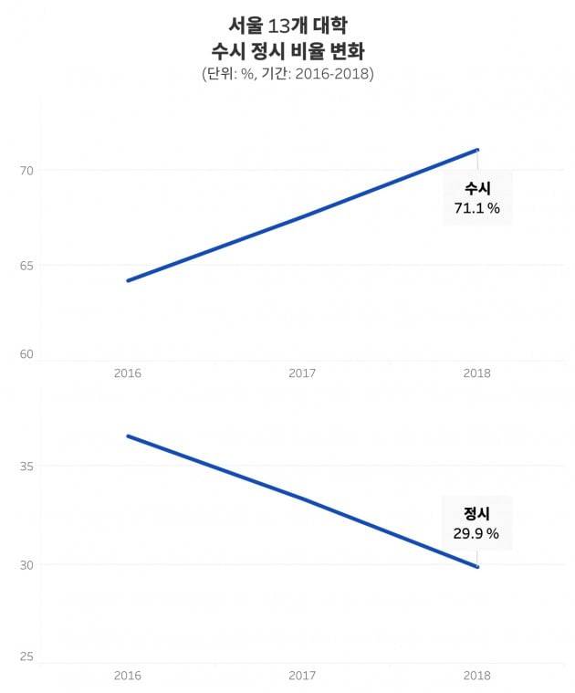 수시 비율은 2016년 64.2%, 2017년 67.6%, 2018년 71.1%로 꾸준히 오르고 있습니다. 반면 정시는 36.5%, 33.3%, 29.9%로 감소하고 있죠. 서울 시내 13개 대학에서는 최근 3년 동안 수시가 증가하고 정시가 감소하는 추세입니다.