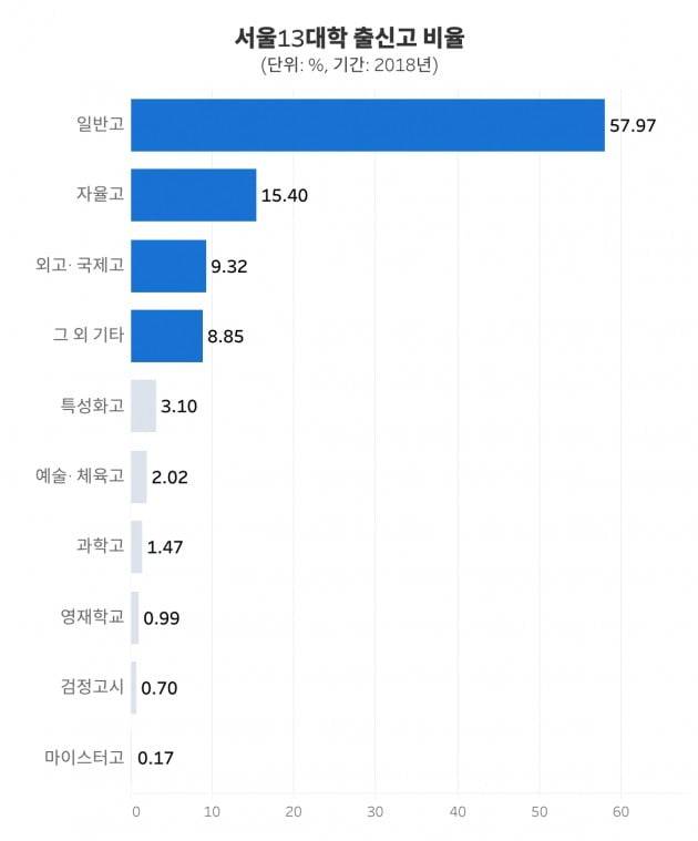 서울 시내 13개 대학 신입생 중 가장 많은 출신고 비율은 '일반고'입니다. 전체 고등학교 중 일반고의 비율이 가장 크기 때문에 당연한 결과입니다. 2018년 기준 일반고등학교는 전체 2358개 고등학교 중 1556개로 65.98%를 차지합니다. 일반고 학생 수는 153만8576명 중 109만6331명으로 71.3% 비율입니다.