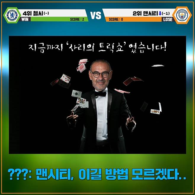 후반 맨시티의 공세를 막아낸 첼시는 후반 33분, 루이스의 헤더 추가골에 힘입어 2-0 승리를 거뒀다. 최근 울버햄튼과 토트넘에게 덜미를 잡힌 첼시가 쓴 완벽한 반전 드라마였다. 또한 이날 첼시에 패한 맨시티는 리그 무패행진을 15경기에서 마감했고, 리그 1위를 리버풀에 내줘야 했다.