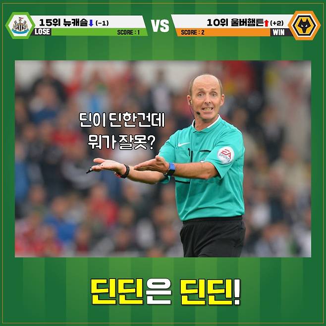 뉴캐슬이 석연치 않은 판정에 화가 단단히 났다. 뉴캐슬은 울버햄튼과의 홈경기에서 전반 17분, 호타에게 선제골을 허용하며 끌려갔다. 전반 23분, 페레즈의 동점골로 균형을 맞췄지만 후반 11분, 예들린이 퇴장당했고, 수적 열세 속에서 후반 추가시간 도허티에게 통한의 실점을 내주며 1-2로 무릎을 꿇었다.