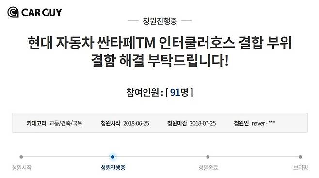 현재 싼타페 인터쿨러 호스 빠짐 현상과 관련한 국민 청원이 진행 중에 있다. 싼타페TM 디젤 차량을 운행 중이라고 밝힌 한 청원자는 “인터쿨러 호스 빠짐 현상을 겪는 구매자들이 스트레스와 위험해 노출 돼 있다”며 “일부 차종에서는 인터쿨러 호스 재설치 및 보강작업 후에도 다시 빠지는 현상이 발생한다”고 지적했다.