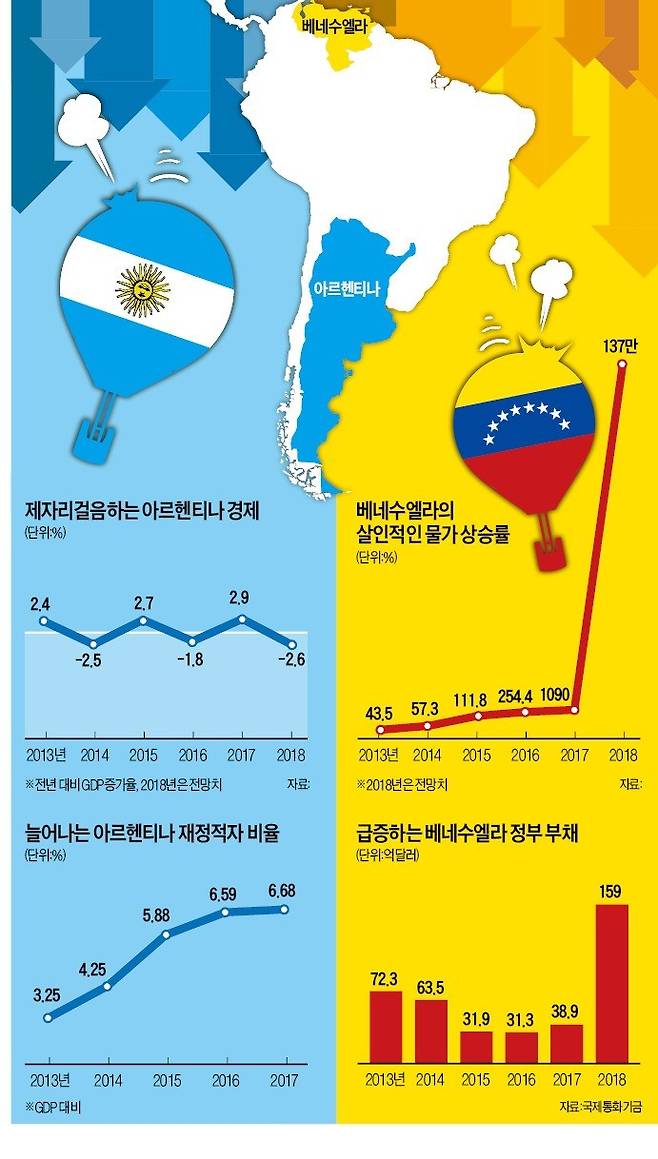 2015년 당선된 마우리시오 마크리 대통령은 경제 파탄을 막기 위해 개혁을 시도했지만 역부족이었다. 다시 외환위기를 맞자 마크리 정부는 지난달 콩, 옥수수, 밀 등 곡물 수출금액 1달러당 4페소의 세금을 부과하고 정부 부처를 절반으로 줄여 공무원을 대폭 감축하겠다고 했다. 국내총생산(GDP) 대비 5~6%에 이르는 재정적자를 줄이는 게 우선이라는 판단에서다.