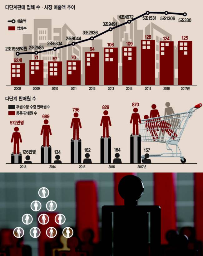 다단계판매 시장은 업체 수와 비교해 그 규모는 해마다 커지고 있다. 지난해 관련 시장 매출액은 5조330억원으로 전년도에 비해 1000억원 가까이 줄었다. 하지만 10년 전인 2008년 시장 매출액 2조1956억원의 두배 이상으로 규모는 불었다.