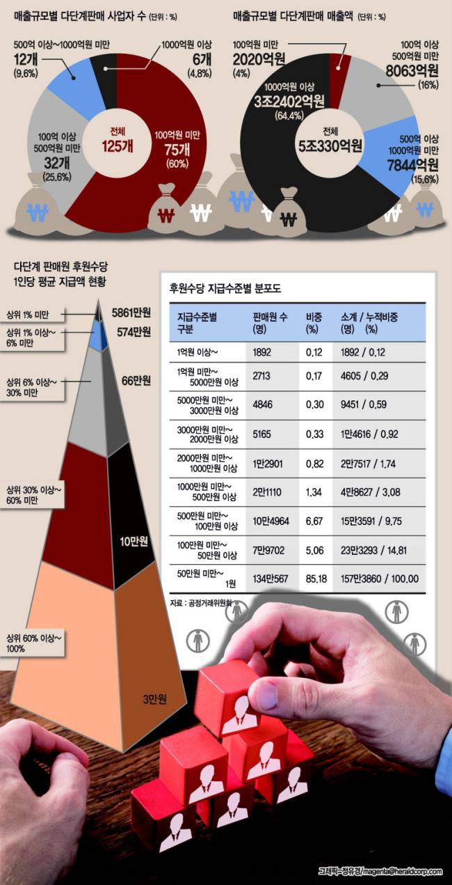 지난해 다단계업체로부터 판매수당ㆍ알선 수수료 등의 후원수당을 받은 판매원의 수는 157만명으로 전체 등록판매원 870만명의 18%에 달했다. 다단계업체들이 이들 판매원에게 지급한 후원수당은 총 1조6814억원으로 전년대비 1.3%(217억원) 감소했다.