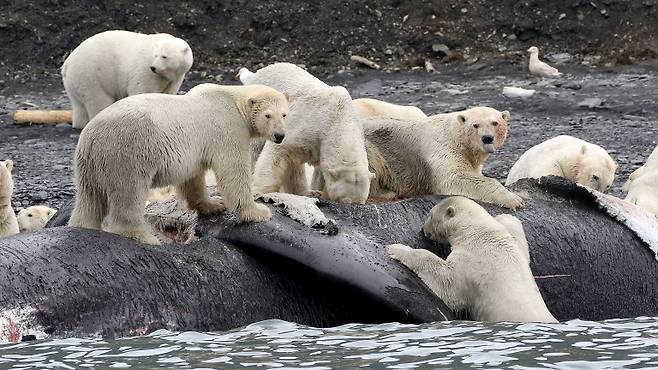 1년 전인 지난해 10월 시베리아 북극 해안가에 무려 230마리가 넘는 북극곰이 한데 모여 만찬을 즐겼다. 북극곰의 허기를 달래준 먹이는 바로 죽은 고래. 약 18m에 달하는 북극고래 사체가 해안으로 떠밀려오자 수많은 북극곰들이 냄새를 맡고 몰려든 것이다.