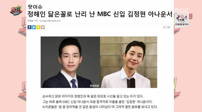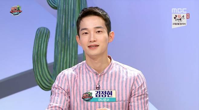 김정현 아나운서는 "입사 55일차 신입 아나운서 김정현이다"고 자기소개를 했다. MC들은 "400대 1 경쟁률을 뚫고 MBC 아나운서가 됐고, 또 정해인 닮은꼴로 화제가 됐다"고 말했다.
