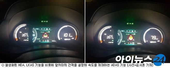 일전에 시승해본 제네시스의 'EQ900'과 'THE K9'에 탑재된 ADAS 기능보다 훨씬 더 정확하고 세분된 차로유지보조 시스템과 고속도로주행보조 시스템을 갖췄다. 앞차와의 간격을 3단계로 분류해 각 간격과 크루즈 기능을 통해 설정한 속도를 유지한다. 차로유지보조 시스템 역시 정확하게 차로를 읽어내는 동시에 눈에 보일 만큼 굴곡진 코너임에도 알아서 핸들링을 조절 주행한다. 차로가 잠시 끊기는 교차로나 지나치게 가파른 코너에는 운전자의 주의가 필요하다.