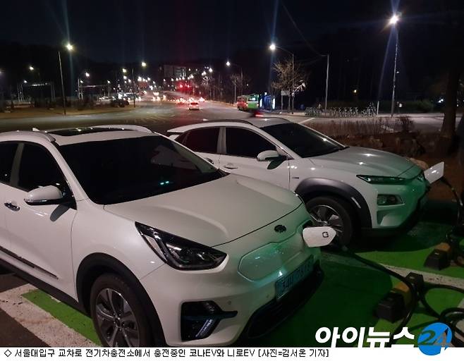 지난 12일 저녁 9시30분경 서울대입구 교차로에 있는 24시간 전기차충전소를 방문했다. 서울대학교를 중심으로 1㎞ 반경에만 약 8개의 전기차충전소가 있으며, 차량 내부 내비게이션을 통해서도 어렵지 않게 찾을 수 있었다. 서울대입구 교차로 전기차충전소에는 2대의 충전기가 설치됐있다. 이미 1대의 충전기에는 '코나 EV'가 충전 중이었다.