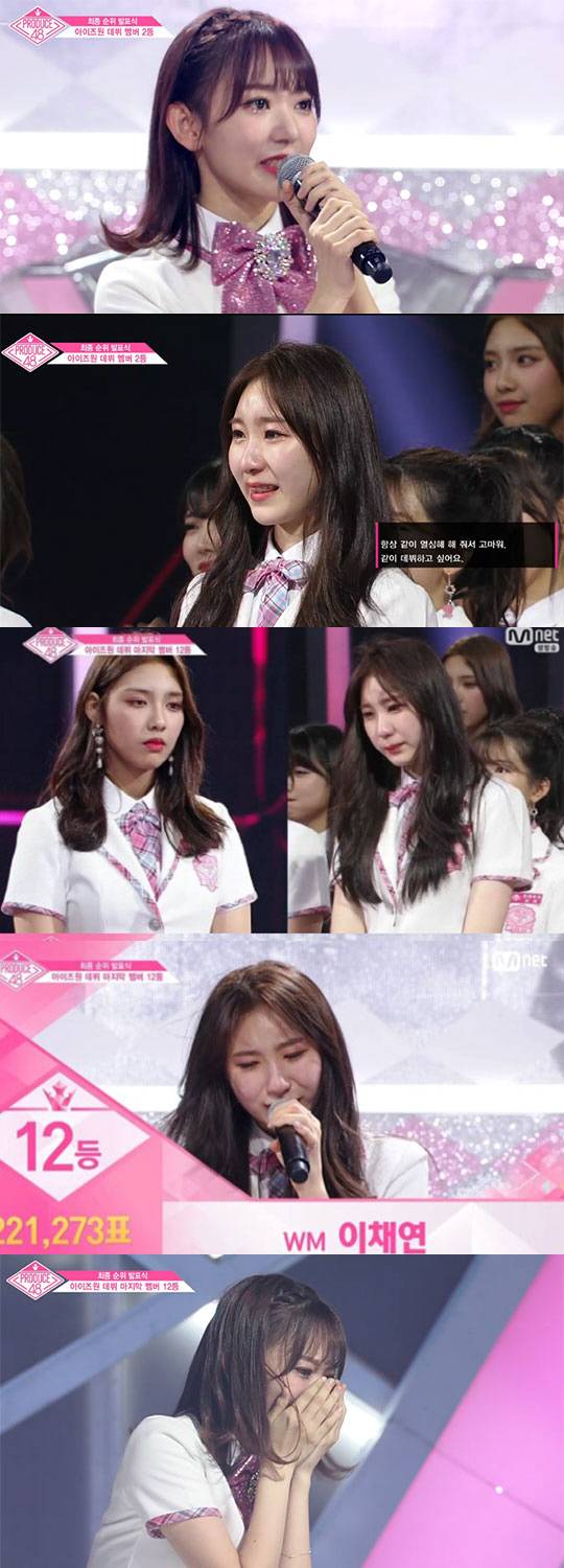 이채연은 "오랫동안 꿈꿔왔던 자리에 서게 해주신 국민 프로듀서님들 감사드린다. 지금 이 마음가짐 그대로 좋은 에너지를 줄 수 있는 사람이 되겠습니다. 오랜 시간 언제나 내 편이었던 엄마아빠와 동생들 고마워"라며 눈물을 흘렸다.
