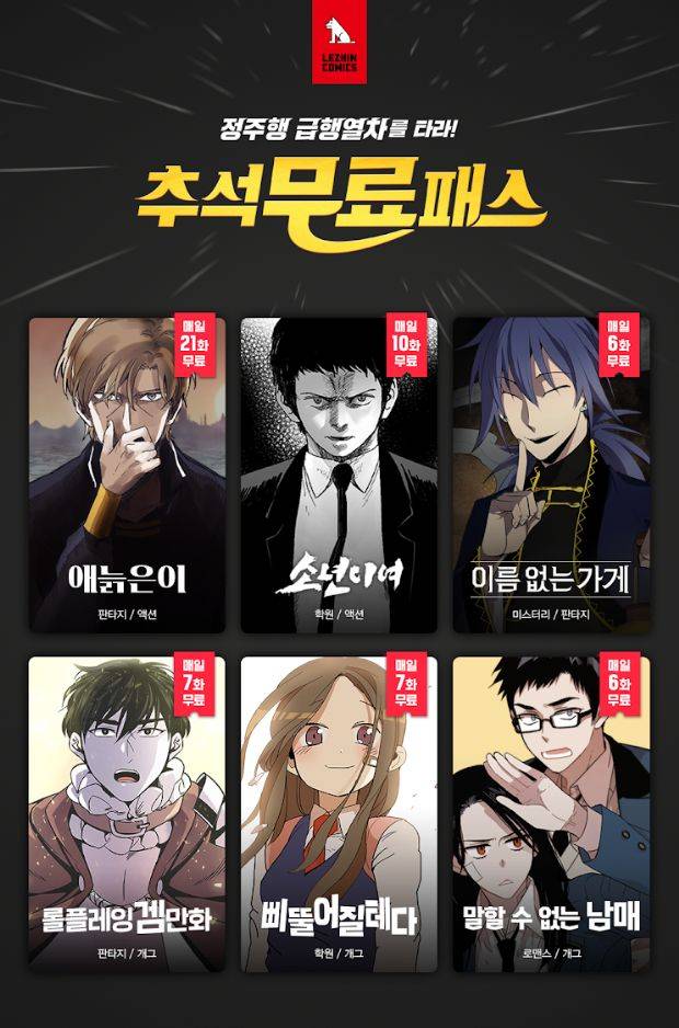 (지디넷코리아=안희정 기자)레진코믹스가 추석연휴를 맞아 웹툰 정주행 ‘추석 무료패스’ 이벤트를 진행한다.
