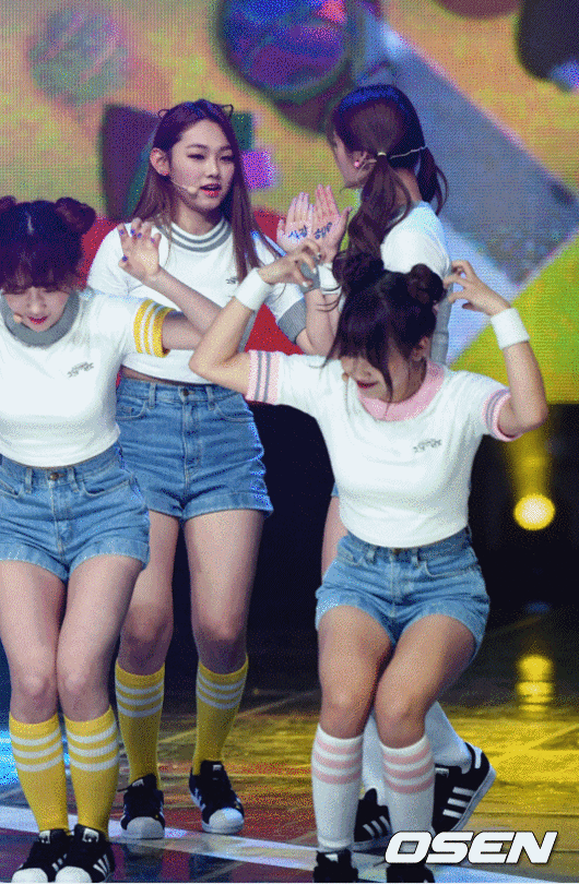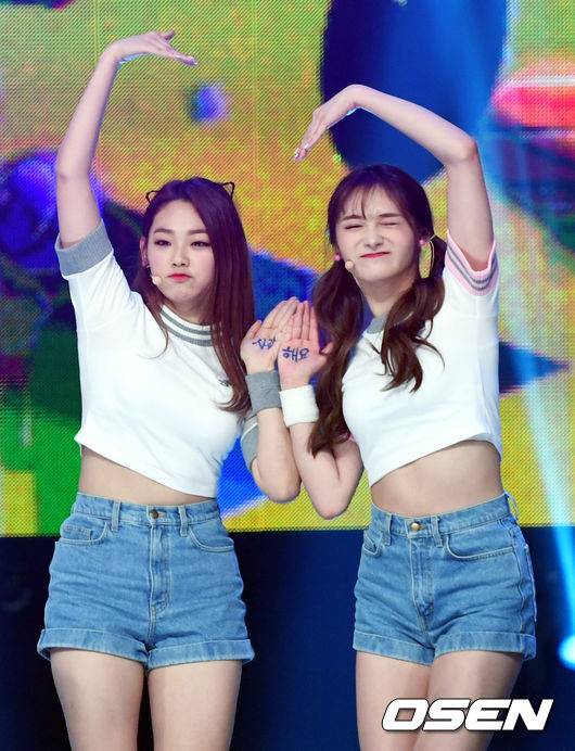 2일 경기도 고양시 인산동구 장항동 MBC드림센터에서 MBC 뮤직'쇼 챔피언(Show Champion)' 생방송이 진행됐다. 걸그룹 아이오아이 굿바이 무대에서 주결경-강미나가 손바닥에 '사랑해요'를 적고 화려한 무대를 선보이고 있다.