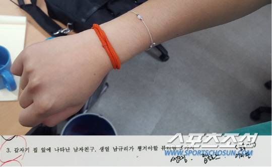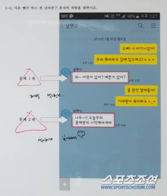 번외편 연애고사는 가상 남친과의 대화 속 남자친구 문자의 속마음을 파악하는 문제입니다. 남규리는 남자친구와 워터파크를 가기 위해 비키니를 사서 자랑하는 상황. 남자친구는 "와~ 어떤거 샀어? 예쁜거 샀어?", "나두~!! 오늘부터 몸매관리 시작해야겠다"라는 반응을 보입니다.