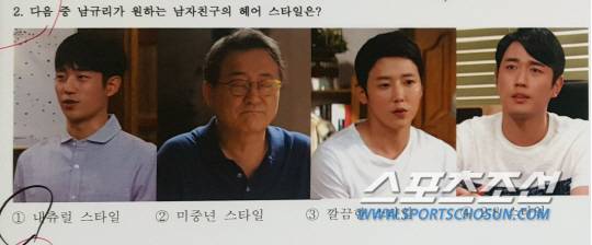 2번 문제. 남규리가 원하는 남자친구의 헤어 스타일을 묻는 문제입니다. 남규리의 답변은 1번 내츄럴 스타일. 공교롭게도 1번 보기의 남자는 '그래 그런거야'에서 남규리의 상대역이었던 배우 정해인 입니다. 편파적인 정답 선택이 아니냐는 질문에 남규리는 "원래 편안한 스타일을 좋아한다"고 공정성을 강조했습니다.