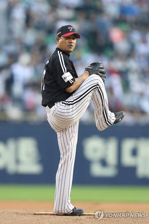 (서울=연합뉴스) LG 트윈스 이상훈 투수 코치가 8일 서울시 잠실구장에서 열린 두산 베어스와 2016 정규시즌 최종전에 시구자로 나서 공을 던지고 있다. 2016.10.8 [LG 트윈스 제공=연합뉴스]
