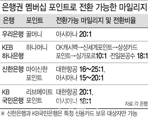 시중 은행이 적극적으로 추진하고 있는 통합 멤버십이 항공사 마일리지 전환의 주요 수단으로 부상하고 있다. 항공사 탑승과 항공사 제휴 신용카드 사용으로 마일리지를 쌓는데 더해 최근에는 은행권 통합 포인트를 활용하는 이들이 많아졌다.