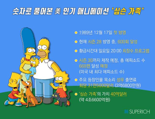 심슨 가족은 가상의 주 스프링필드를 배경으로 아빠 호머ㆍ엄마 마지ㆍ자녀 셋 바트ㆍ리사ㆍ매기의 일상을 중심 소재로 한 만화영화다. 폭스 TV에서 일요일 황금시간대라 불리는 저녁 8시에 방영되는 이 프로그램은 평균 720만 가구가 시청한다.