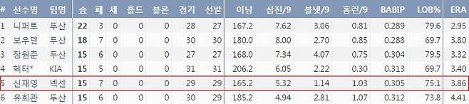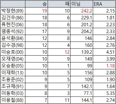 | ▲ 올 시즌 15승 이상을 거둔 투수들의 주요 기록 (출처: 야구기록실 KBReport.com) |