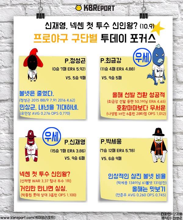 KBO 리그 구단별 키플레이어와 이슈를 한 컷으로 간단히 정리하는 '오늘의 프로야구' KBO 투데이 포커스 정규시즌 최종편입니다. 오늘 열리는 모든 경기는 이 한 컷만 미리 보시면 됩니다. <편집자말>