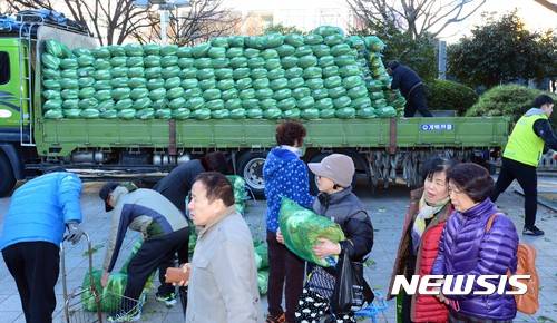 【부산=뉴시스】 하경민 기자 = 24일 오전 부산시청 앞에서 열린 부산농협 김장채소 직거래장터를 찾은 시민들이 배추와 무를 구입하고 있다.
