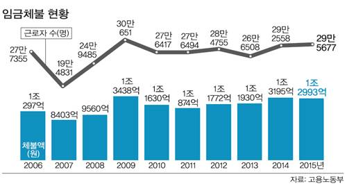 21일 고용노동부에 따르면 2014년 우리나라에서 임금을 제대로 받지 못한 근로자는 29만2558명, 체불된 임금 규모는 1조3195원에 달했다.