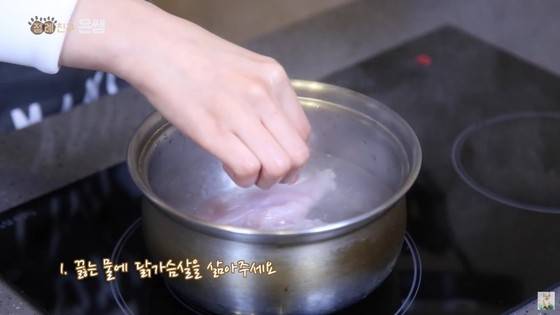 잘 삶아진 닭가슴살은 길게 찢어 주세요.