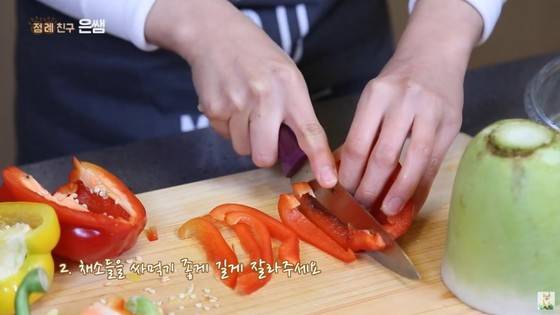 채소들을 싸먹기 좋게 길게 잘라주세요. 강아지 종에 따라 입 크기가 다를텐데요. 강아지가 먹기 좋은 크키로 편안하게 잘라주세요.