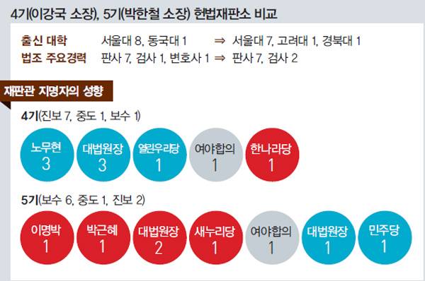 통합진보당 정당해산 사건에서 선고시기를 두고 양측에 교감이 있었으리라는 보도는 사실이 아닐 가능성이 크다. 따라서 탄핵심판에도 별다른 영향이 없으리라는 것이 법조계의 분석이다. 사실은 정당해산 사건을 심판하던 2014년 여름부터 이제는 선고해도 된다는 의견이 있었다. 하지만 통진당이 증거를 대량으로 내면서 오히려 선고가 연말로 늦춰졌다. 청와대의 뜻에 따라 당겨졌다고 보기는 어려운 정황들이다. 여기에 박 소장은 선고는 가능한 한 신속해야 한다는 소신이 강하다. 일례로 지난 3월 신문방송편집인협회 토론회에서 김영란법은 시행일인 9월 전에, 국회선진화법은 20대 국회 개원 전인 5월 전에 선고하겠다고 말했다. 이날 토론회에서는 “헌재법이 정한 180일 선고시한이 사실상 지키지기 어려운 것인데 개정하는 게 어떤가”라는 질문이 있었는데, 박 소장은 “국민의 재판청구권을 보장하는 취지이기 때문에 조항을 삭제하는 건 적절치 않다고 본다”고 했다. 헌재 관계자는 “박 소장이 전혀 사실이 아니라고 밝히면서 별달리 반응하지 않은 것으로 안다”고 했다.