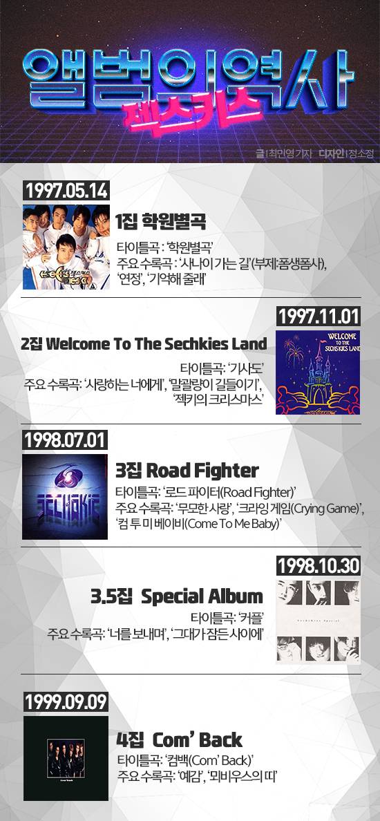 젝스키스는 지난 1997년 5월, 정규 1집 ‘학원별곡’을 발매하며 공식 데뷔했다. 앨범 커버 속 멤버들은 흰색 무대 의상을 입고, 카메라를 바라보고 있다. 커버 중앙 하단에 자리 잡은 젝스키스 문구까지 더해져 멤버들은 마치 게임 속 캐릭터처럼 보여 눈길을 끈다.