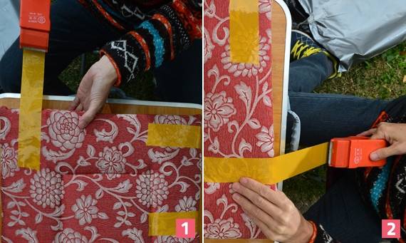 만드는 방법 1 방석 두 장을 포개어 놓은 다음 전체적으로 ‘ㄱ’자 모양이 되도록 테이프를 붙여 두 방석을 연결한다. ‘ㄱ’자의 윗부분엔 두 번, 옆 부분엔 세 번 붙이면 된다.