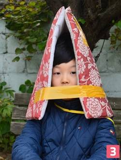 3 테이프를 아예 붙이지 않은 면으로 머리를 집어넣고 ②에서 붙인 테이프 위의 구멍으로 고개를 내밀어 시야를 확보한다.