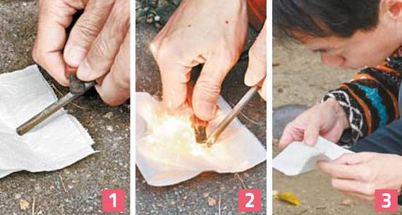 재료 파이어 스타터, 철 조각, 휴지 혹은 마른 낙엽