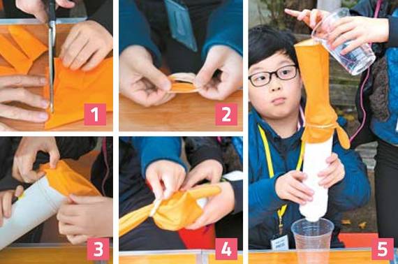 5 출수구(호스를 끼우는 아랫부분)가 아랫쪽으로 가도록 간이 정수기를 세운다. 출수구 아래에 정수된 물을 받을 컵·대야 등을 놓은 후 고무장갑의 손을 넣는 구멍에 물을 붓는다.
