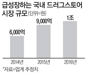 1일 업계에 따르면 K뷰티 바람을 타고 급성장하고 있는 한국형 드러그스토어시장 규모는 올해 1조원을 넘어설 것으로 예상된다. 2014년 6000억원, 지난해 9000억원에서 가파른 성장세를 보이고 있다. 시장 점유율 85%를 차지하고 있는 업계 1위 CJ올리브영은 1999년 첫 매장을 연 후 현재 매장 640개를 운영하고 있으며 올해 매출액이 9000억원을 넘을 것으로 기대한다. 지난해 7603억원보다 약 54% 늘어난 수치다. 125개 매장을 두고 있는 왓슨스코리아의 지난해 매출액은 1274억원이었으며 올해 목표는 1500억원이다.