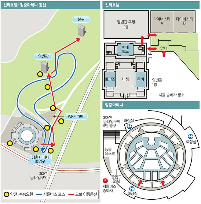 올해 17회째를 맞는 세계지식포럼은 서울 장충아레나(장충체육관)와 신라호텔이 메인 무대다. 지난해 세계지식포럼 개막식 장소로 사용됐던 장충아레나는 개막 당시 가로 55m의 초대형 스크린으로 참석자들의 이목을 사로잡은 바 있다. 올해 역시 대형 스크린과 화려한 개막식 동영상으로 참석자들을 맞을 예정이다. 규모가 큰 만큼 11일 개막식 때 대규모 청중이 몰리면서 교통 체증을 빚을 가능성이 높으므로 포럼 참석자들은 대중교통을 이용해 일찍 도착해 자리 잡고 번거로움을 피하는 게 좋다.