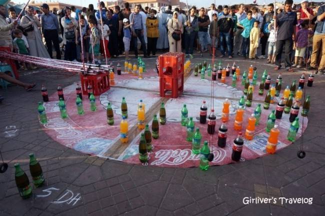 시간이 늦어질수록 무엇인가 준비를 한 사람들이 파라솔을 설치하고, 아니면 의자라도 가지고 나와 자리를 잡는다. 음료수가 원형으로 놓인 판에 낚싯대에 매달린 원형의 고리를 음료수 입구에 놓는 게임이 한창이다. 보는 것만큼 쉽지 않은지 아직은 성공하는 사람이 없다. 모여든 모로코 사람들의 호기심 어린 눈빛이 더 재미있다.
