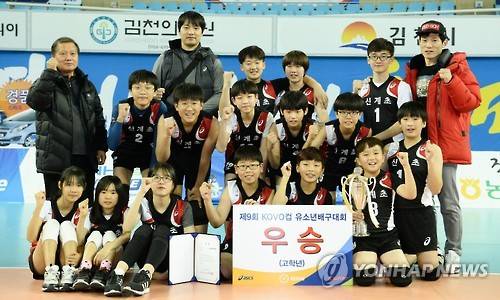 (서울=연합뉴스) 지난 11일 경북 김천실내체육관에서 열린 '제9회 KOVO컵 유소년 배구대회' 고학년 경기에서 우승한 대전신계초등학교가 기념촬영하고 있다. 2016.12.12 [한국배구연맹 제공=연합뉴스]