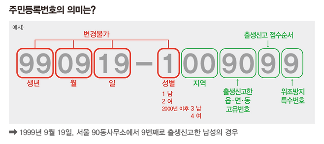 주민등록번호에는 해당자의 나이, 성별, 출생신고 지역 등이 담겨 있다. 앞 6자리는 생년월일, 뒤 첫 자리는 성별을 의미한다. 2000년 이전 출생자 중 남자는 1, 여자는 2를 사용한다. 2000년 이후 출생자의 경우 남자는 3, 여자는 4를 쓴다. 뒷자리의 두 번째와 세 번째 숫자는 지역코드다. 출생신고를 한 지역이 기준이 된다. 00~08은 서울, 09~12는 부산, 13~15는 인천, 16~25는 경기도, 26~34는 강원도, 35~47은 충청도, 48~54는 전라북도, 55~56은 전라남도, 67~90은 경상도다. 다음 네 번째와 다섯 번째 숫자는 출생신고를 한 읍∙면∙동 주민 센터의 고유 번호이고, 여섯 번째 숫자는 출생 신고를 당일 몇 번째로 접수했는지를 의미한다. 마지막 자리는 위조 방지를 위한 특수 번호다. 나머지 12자리를 특정 공식에 대입하면 이 숫자가 산출된다.
