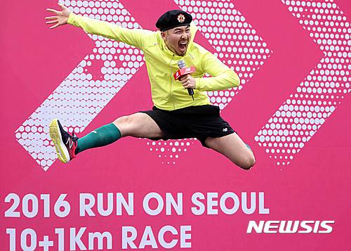 【서울=뉴시스】 박문호 기자 = 4일 오후 서울 영등포구 여의도와 마포 일원에서 개최된 '2016 런온 서울(RUN ON SEOUL)'에 참가한 방송인 노홍철이 포즈를 취하고 있다.