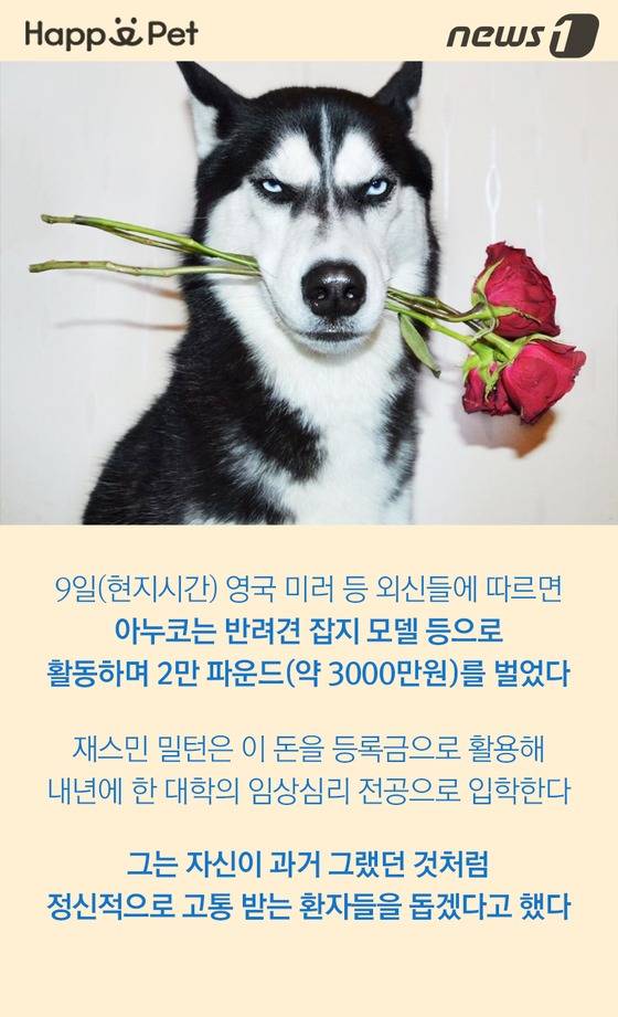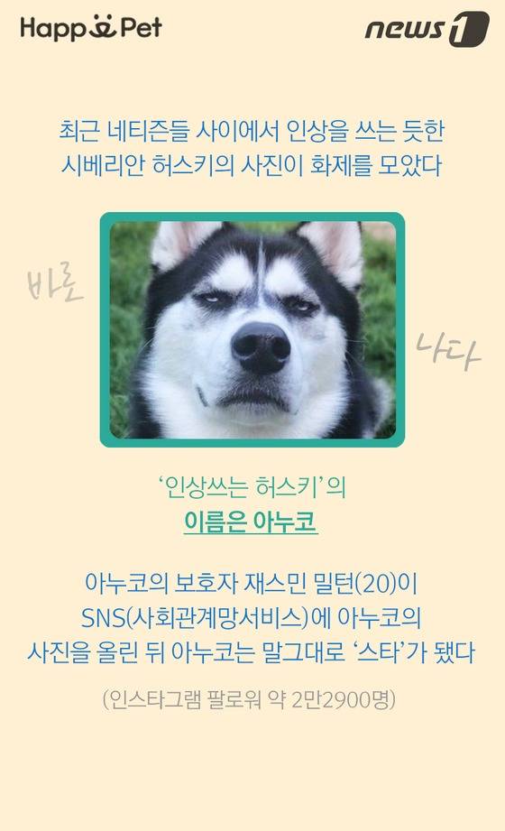(서울=뉴스1) 이기림 인턴기자,방은영 디자이너 = SNS(사회관계망서비스) 스타 강아지가 최근 네티즌은 물론 언론의 관심까지 받고 있다. 이 강아지의 이름은 '아누코'. 인상 쓴 표정을 한 시베리안 허스키로, 강인해보이는 모습 속엔 귀여움도 갖고 있다.