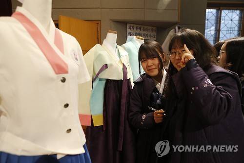 (횡성=연합뉴스) 류일형 기자 = 민족주체성 교육을 표방하는 강원 횡성군 소재 민족사관고의 새 교복 샘플 전시회가 31일 학교 소강당에서 열렸다.