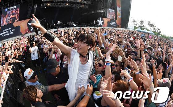 지난 14일 오후 인천 송도 달빛축제공원에서 열린 ‘인천 펜타포트 락 페스티벌’에서 '사무라이 하트(Some Like It Hot!!)'로 유명한 일본의 4인조 록밴드 스파이에어(Spyair)의 리드보컬 이케가 관중들과 함께 공연을 펼치고 있다. 지난 12일부터 14일까지 3일간 열린 이번 공연에는 국내외 80여개 유수 락 그룹들이 참여해 열정적인 무대를 선보였다. (인천시 제공) 2016.8.15./뉴스1