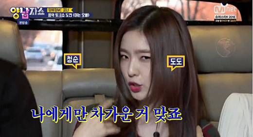 이 밖에 아이린은 영화 속 배우 하정우의 '김 먹방' 장면을 흉내내는 등 멤버들과 함께하는 예능이라 한층 여유로운 모습이었다.