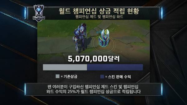 롤드컵을 기념하는 ‘챔피언십 제드’ 스킨과 와드 스킨 판매액의 25%가 추가 상금으로 적립되어 현재 롤드컵 총상금 규모는 507만달러(한와 약58억원)로 늘어났다. 이는 기존 상금의 두 배 이상이다.