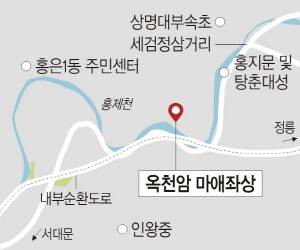 서울 종로구 홍지동에 있는 상명대 앞 세검정삼거리에서 홍제천을 따라 서대문구 홍은사거리 쪽으로 150m쯤 걷다 보면 홍지문(弘智門)이 나온다. 홍지문은 한양도성과 북한산성을 연결하는 관문(關門)이었으며 지금은 종로구와 서대문구를 가르는 경계다. 여기서부터 다시 홍은사거리 쪽으로 450m 정도 더 가면 홍제천 위에 놓인 보도교(普渡橋) 건너편에 보도각(普渡閣)이 씌워 있는 높이 5m의 거대한 암석을 볼 수 있다. 2014년 보물 제1820호로 지정된 옥천암 마애좌상(玉泉庵 磨崖坐像·사진)이다.