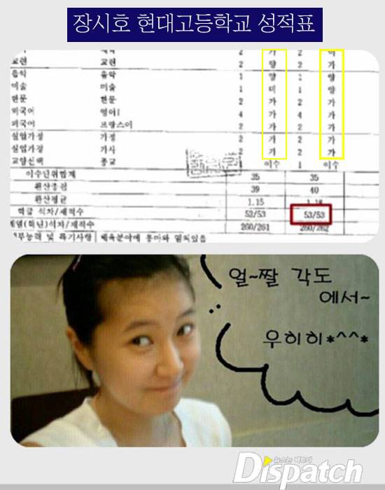 장시호는 현대고등학교를 진학했다. 1학년 1학기 성적은 가·가·가·가·가·양(교련)·가·가·양(음악)·가·가·미(미술)·가·가·가·가·가. 학급석차로 따지면, 1학기 52등 2학기 53등이다.