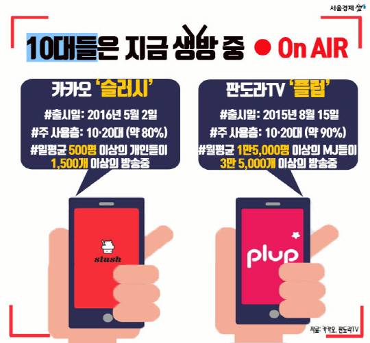 업계에서 1인 방송 주요 소비층이 10대인 것을 파악해 모바일 개인방송 서비스를 내놨기 때문. 일례로 지난 5월 카카오에서 출시한 ‘슬러시(slush)’는 10대들의 비밀 아지트로 떠올랐다. 슬러시는 누구나 스마트폰으로 동영상을 촬영하고 바로 방송할 수 있는 모바일 개인방송 서비스로, 카카오톡과 연동해 10·20대들이 손쉽게 사용할 수 있어 출시 한 달 만에 인기 소셜앱으로 등극했다. 주로 학교 가방 싸기부터 수다, 책상 정리, 방 청소, 화장 등 지극히 일상적인 내용을 주제로 실시간 생중계가 이뤄진다. 기존의 아프리카TV, 유튜브 등의 동영상 플랫폼이 게임, 먹방 등의 콘텐츠가 주를 이루는 것과 대조적이다.