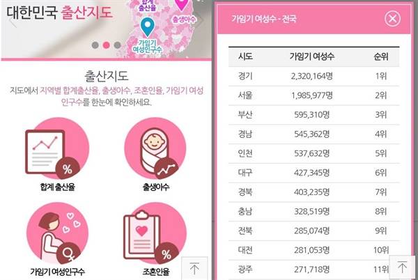 | ▲ 29일 행정자치부가 공개한 '대한민국 출산지도' 사이트. '가임기 여성 수' 통계 수치와 지역별 순위를 표시해 논란이 됐다. |