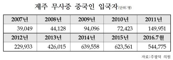제주를 통해 국내 다른 곳으로 이동하는 환승관광 무사증 입국자의 99.6%(전체 19만8506명 중 19만7686명)도 중국인이다. 주 의원은 “지난해 중국인 무사증 입국자 중 1만9658명은 불법체류자였고, 이 숫자가 올해는 7월까지 2만558명에 이른다”며 “무사증 제도가 관광활성화의 본래 목적을 벗어나 악용되고 있다”고 우려했다.